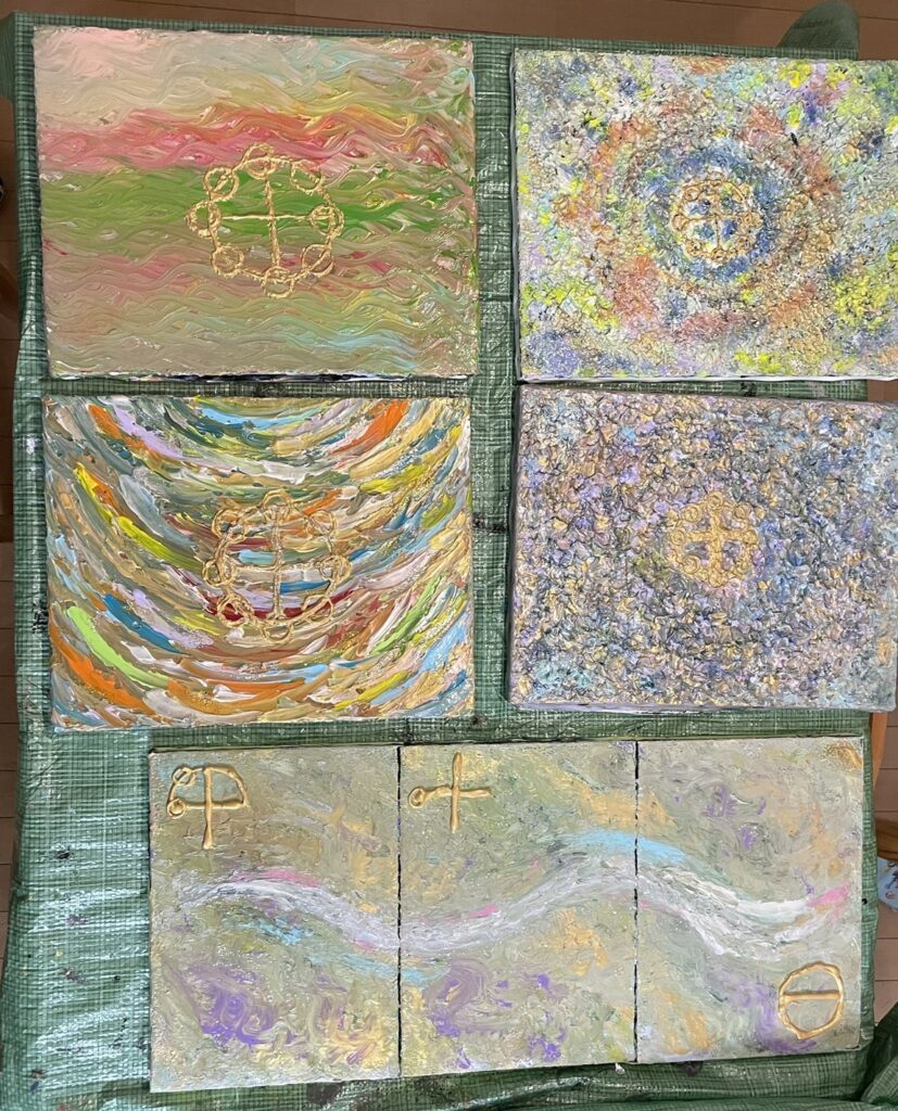 カタカムナ宇宙アートとして、仕上げは、カタカムナ文字を一文字、シンボルマークとして入れます。乾かしてニスを塗って完成!!